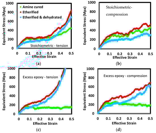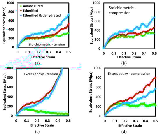 The effects of each processing step, resin chain length, and the sign of the stress in uniaxial loading (i.e., tension versus compression) are illustrated in Figure 13 and Figure 14. The method for loading the samples is described in [52]. A plane stress state (e.g., biaxial tension) and strain rate is selected. That stress state is applied for a series of brief periods of dynamics. At the end of each period, the effective strain is computed and compared with the target value for the selected strain rate. Depending on the level of error among the actual and target strains, the stress magnitude is adjusted for the upcoming period. For a given system and state (e.g., short-chain stoichiometric cured by amine addition only), compression generally resulted in higher strength and less strain hardening. In excess epoxide formulations with only amine crosslinks, systems remained plasticized to the extent that they were perfectly plastic (e.g., short-chain tension or long-chain compression cases) or strain softening (e.g., short-chain tension or long-chain compression cases) following yield. These networks did not have sufficient cross-link density to mechanically diffuse strain energy to less loaded strands.