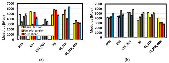 Comprehensive and quantitative comparison of moduli under several plane stress states provide additional insight into the relations among properties and structure. Moduli in biaxial tension, uniaxial tension, pure shear, and uniaxial compression are shown in Figure 15. Among the discernable relations is that etherification increased modulus in pure shear for stoichiometric formulations but lowered them in excess formulations. In pure shear, the system under load is generally not dilatational. In stoichiometric formulations, there were comparatively few added ether links, whereas the number of ether links added was the highest in the excess formulations. Further, these ether links are generally added in the immediate vicinity of amine crosslinks. It is inferred that such placements led to a more compliant network in shear.