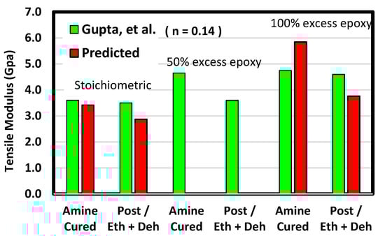 Figure 16. Predicted tensile modulus for the short-chain system compared with the experiments of Gupta et al. [6]. Amine-cured moduli for the same formulation are plotted together. Results from post-curing experiments and predictions including both etherification and dehydration are plotted next to each other.