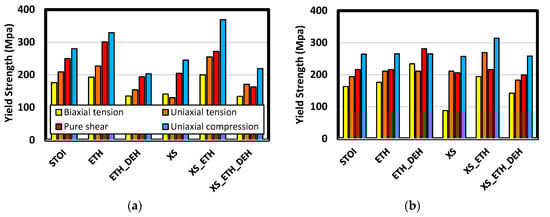 Figure 17. Comparison of yield strength among various stress states. Charts (a) and (b) are results for short- and long-chain systems, respectively.