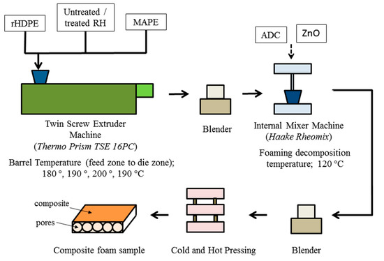 In this study, approximately 6 wt.% ADC powder was used as an exothermic blowing agent. ZnO was used as an activator to reduce heat release from the ADC during compaction. The ZnO quantity was kept constant at 1.5% by weight in all formulations. This quantity was selected on the basis of the previous studies, which reported that this action reduced the optimum ADC heat release. After the mixture followed the curve of the match for approximately 2 min, ADC and ZnO were added. Then, the mixture was left for 10 min and milled using a milling machine (LP50, LABTECH Engineering Company, LTD. Machine Samutprakarn, Thailand and incorporated into a mould with an area of 14 × 14 mm and thickness of 3 mm to undergo the hot and cold pressing. The temperature and pressure were set at 180 °C and 6.9 MPa, respectively. After the incubation period (10–20 min), the specimen was cooled for approximately 3 min. The pressure on the samples was maintained at 1000 psi. Then, the pressure was removed, and the composite sample was left to expand [29]. Figure 1 shows the process of producing the RH/rHDPE composite foam.