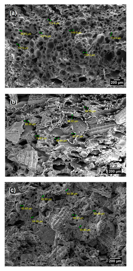 Aside from foam density, the foam properties are greatly affected by the geometry of the cell (either open or closed cells) and the distribution of cell size and its uniformity. The cell size and density are used to evaluate the morphology of cells. The SEM micrographs of RH/rHDPE-based composite with different RH contents (10, 30 and 50 wt.%) are shown in Figure 2a–c. All composites show the closed cell structure with of macrocellular foam (cell dimension > 100 µm) for 10 wt.% RH and microcellular foam (cell dimension = 1–100 µm) for 30 wt.% RH and 50 wt.% RH. Many studies have reported that polymer composite with microcellular foam has superior impact strength [38,41], toughness [42], stiffness-to-weight ratio [43] and lower material weight and cost compared with the conventional foam or unfoamed polymers. In general, microcellular plastics with cell size <10 µm and cell density >109 cells/cm3 have better mechanical properties compared with the conventional foam products [33]. Guo et al. [30] stated that the mechanical properties of the composite is proportional to the cell density. Notably, the of RH fibre in the polymer matrix has enhanced the morphology of the composite foam cells (Figure 2).