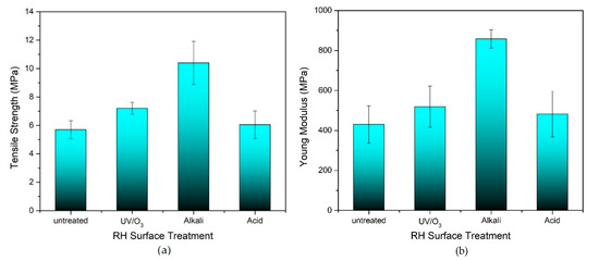 (a) Tensile strength and (b) Young’s modulus of untreated, alkali- and UV-treated RH with 50 wt.% RH.