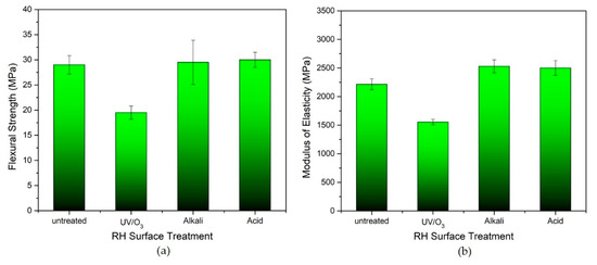(a) Flexural strength and (b) modulus of elasticity of untreated RH, UV-, alkali- and acid-treated RH with 50 wt.% RH loading.