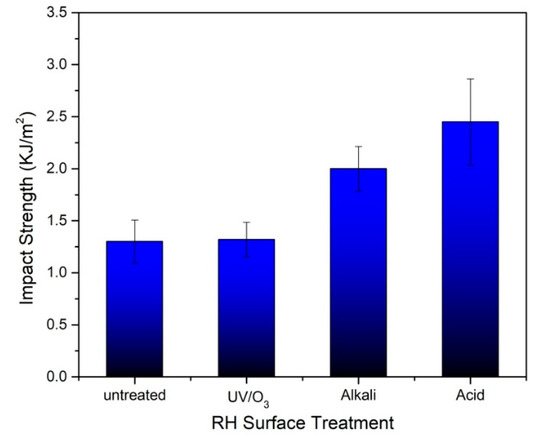 Impact strength of untreated, UV-, alkali- and acid-treated RH with 50 wt.% RH loading.
