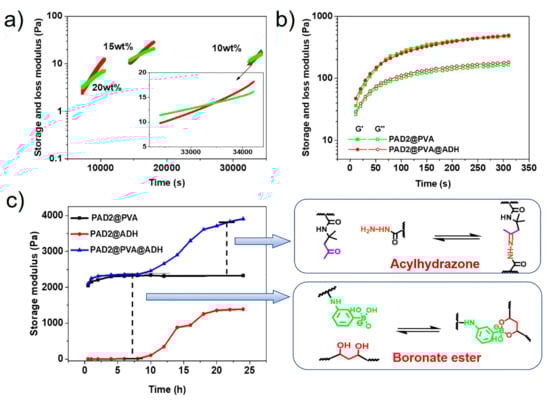 - Guo, R.; Su, Q.; Zhang, J.; Dong, A.; Lin, C.; Zhang, J. Facile Access to Multisensitive and Self-Healing Hydrogels with Reversible and Dynamic Boronic Ester and Disulfide Linkages. Biomacromolecules 2017, 18, 1356–1364. [Google Scholar] [CrossRef] [PubMed]