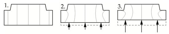 Current research at the Institute of Polymer Technology focuses on the use of the pressure dependence of the solidification behavior in the injection molding process of pressure-induced solidification (CIS) for the production of thick-walled optical components. Here, special challenges arise with regard to an economic cycle time with simultaneously good optical properties and high dimensional accuracy [26]. Due to the poor thermal conductivity of the polymer in combination with the large wall thicknesses, cooling times of up to 20 min result in conventional production of such components by injection molding [27]. In addition, the two-phase cooling of the components often results in residual stresses, sink marks and distortion. These represent rejection criterions, especially in the field of imaging optics [26]. In CIS, the application of a high pressure at a temperature close to the glass transition decouples the solidification from the cooling, with the shrinkage of the component in the subsequent cooling step taking place over the entire cross-section with the same coefficient of thermal expansion. This results in components, free of residual stresses and with high dimensional accuracy [28]. In this processing technique, the melt is injected into the cavity, which has a temperature above the glass transition. After a so-called adaptation time, during which the polymer cools down to the mold temperature, the melt is compressed by a piston. However, the one-sided compression movement results in local pressure differences between thinner and thicker component areas, which in turn induces flow processes to the center of the component [29]. Figure 1 shows the expected melt flow within the cavity cross-section with one-sided compression as a temporal sequence.