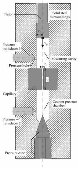 The analysis of the pressure-induced solidification during flow was carried out with a counterpressure Rheograph 75 (Goettfert Werkstoff Prüfmaschinen GmbH, Buchen, Germany) with a piston diameter of 15 mm. The measuring device used was specified with an accuracy of 0.4% for pressures of 20–2500 bar, whereby the maximum pressure corresponds to a force of 40 kN. To increase accuracy, the elasticity and deformation of the frame, the drive train and the force transducer are calculated as a function of the stamp force and automatically corrected. Figure 2 shows the test setup schematically based on [53]. The measuring chamber was first heated to the test temperatures of 220, 230, 240 and 250 °C, and then filled in several steps with polymer granulate, manually compressed and degassed until the chamber was completely filled without air inclusions. In order to ensure the melting of the polymer, the piston was lowered onto the melt at a pressure of 2 MPa and held at the respective temperature for 5 min. Afterwards the molten polymer charge was pressed through an installed capillary and the counterpressure chamber. After the entire system was filled with degassed polymer melt, the counterpressure chamber was closed by screwing in the pressure cone, Figure 2. The temperature was maintained for a further 5 min, followed by compression. During compression at different piston velocities (0.0028 mm/s, 0.056 mm/s, 0.028 mm/s) the following data were recorded at a frequency of 2 Hz: piston position and velocity, piston force and pressure at the pressure sensors type HDA 2174 (Goettfert Werkstoff Prüfmaschinen GmbH, Buchen, Germany) in the measuring cavity p1 and in the counterpressure chamber p2. The piston force was converted into the piston pressure pp with the chambers cross-section of 176.71 mm2. The volume of the measuring cavity was 28 cm3, the volume of the counterpressure chamber was 2.73 cm3, the capillary’s length to diameter ratio was 20/1. Table 2 shows an overview of the conducted HPC experiments.