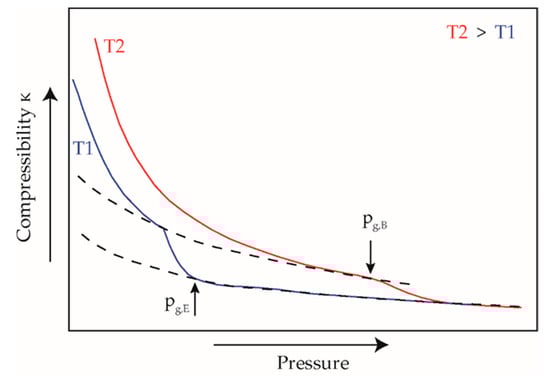 Calculated isothermal compressibility for evaluation of solidification pressure in pvT measurements, adapted according to [54]; pg,E: pressure of ending solidification; pg,B: pressure of beginning solidification.