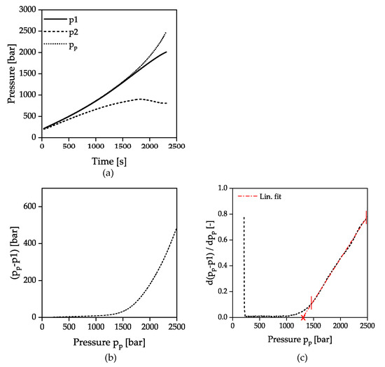 At a pressure of approx. 1000 bar, the pressure p1 and the piston pressure pp begin to diverge. This was attributed to the fact that the pressure can no longer be transferred correctly through the pressure bore to the pressure sensor due to the incipient solidification at the capillary inlet. At the same time the stopping flow through the capillary prevents further pressure transmittance to the pressure sensor p2 and the slope decreases. The pressure at the time of the divergence between the signals p1 and pp was defined as the solidification criterion. The representation of the pressure difference Δp between pp and p1 as a function of pp shows a parabolic curve with nearly linear increasing gradient after reaching a certain pressure, Figure 4b. The vertex of the parabola marks the solidification and was determined by the intersection of a linear fit in the high-pressure range with the x-axis applied to the first derivative of the pressure difference with respect to pp. The intersection point with the x-axis is marked by a cross, as shown in Figure 4c. It should be noted that the linear extrapolation to the point of intersection with the x-axis does not mark the exact beginning of the solidification, since the difference from the pressure signals seems to increase already from approx. 1000 bar. The inconstant gradient of the pressure signal pp after diverging indicates that the glass transition is completely passed through. Due to the force limitation of the apparatus at 2500 bar, no clear limitation of the solidification range similar to the isothermal pvT measurements can be made.