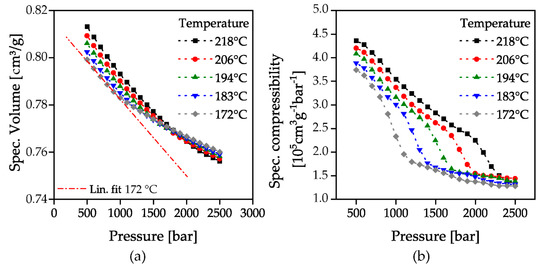 As described above, the specific volume of the material exhibits a slope change at a certain pressure, Figure 5a. To illustrate this, a linear fit for the temperature of 172 °C in the low-pressure range was added. This marks the passing of the glass transition by the corresponding pressure. The specific compressibility calculated via Equation (1) from the specific volume curves is shown in Figure 5b. At each temperature, the compressibility decreases almost constantly with increasing pressure, until the slope change indicates the beginning of the pressure-induced glass transition. At the end of this glass transition, the compressibility remains at an almost constant level.