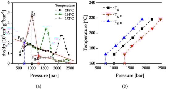 The beginning and end of the glass transition was determined by the attachment of tangents to the parabolic curves of the first derivative of specific compressibility, Figure 6a. The curves of specific compressibility (Figure 5b) show a change in curvature as the glass transition is passed through. When the solidification pressure is reached, the curves show a right-hand curvature which then changes to a left-hand curvature at the turning point. This is illustrated by the first derivative of the specific compressibility (Figure 6a), which shows a maximum at the point of maximum curvature change. The areas with the same curvature correspond to the compressibility before reaching or after passing through the glass transition. This is represented by the constant slope of the first derivative of the specific compressibility before and after the maximum in Figure 6a. By the intersection of the attached tangents of the second derivative’s maximum with the constant slopes before and after passing through the glass transition, the beginning and the end of the glass transition can be evaluated. The evaluated points are marked with a red-colored cross in Figure 6 as an example for the temperature 172 °C. The evaluated solidification pressures were then plotted over the investigated temperatures. The resulting number of the beginning and end of the glass transition is shown in Figure 7b together with the pressure with a maximum change in compressibility. A linear increase of the solidification pressure with increasing temperature could be proven. The increase of the glass transition is approx. 25 bar/K and is therefore lower than in previous investigations (33–37 bar/K) [17]. The reason for this could be that these measurements were carried out in a stationary state with a waiting time after each pressure increase instead of a constant compression.