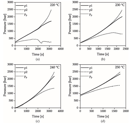 Pressures p1, p2 and pp for the Temperatures 220 (a), 230 (b), 240 (c) and 250 °C (d); the velocity of the piston was 0.0056 mm/s.