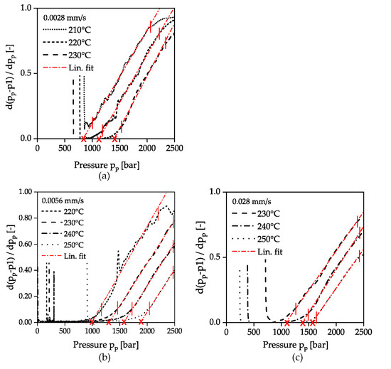 As described in Section 2.3 (Figure 4), the evaluation was carried out according to the specified solidification criterion by plotting the first derivative of the deviation between the pressure signals pp and p1 as a function of the pressure pp. The evaluation of all investigated temperatures and compression velocities are summarized in Figure 8. After an area, with no difference between the signals p1 and pp, the deviation increases exponentially when the solidification pressure is reached. In this range, the calculated derivative of the difference between the pressure signals p1 and pp in Figure 8 shows a linear course in all experiments performed, which is why a solidification pressure could be determined by linear extrapolation. The intersection of each linear fit with the x-axis is marked by a cross. As it can be seen in Figure 8a higher piston velocity results in a shift of the incipient solidification to lower pressures pp. This reinforces the assumption that solidification due to pressure time derivatives can already occur at lower pressures. According to the mechanism described, the considered time scale decreases with higher compression velocity, while the relaxation time increases at the same time due to the increase in pressure and the specified constant temperature. The result is that even at lower pressures the polymer can no longer follow the externally applied changes and thus falls out of equilibrium and solidifies.