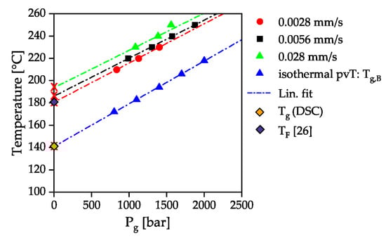 Due to the already described high pressure dependence of the glass transition of 0.3 K/MPa, a PC, type Makrolon LQ2647 (Covestro AG, Leverkusen, Germany), with a glass transition temperature of 144 °C [52] was used for the analysis.