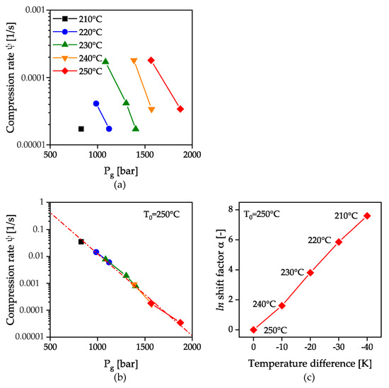 is obtained. This is independent of the geometries and setting parameters of the measuring instrument. The logarithmic representation of the solidification pressure from the HPC measurements for all measured temperatures as a function of this calculated compression rate is shown in Figure 10a. A constant increase of the solidification pressure with temperature can be observed with simultaneous linear decrease of the solidification pressure with exponentially increasing compression rate. By shifting the temperature curves at a reference temperature of 250 °C as a function of the compression rate with a shift factor α, the temperature invariant representation of a master curve to describe the solidification behavior during flow appears possible, Figure 10b. The shifting coefficients were calculated by dividing the compression rate at the desired temperature by the compression rate of the reference temperature, and are shown in Figure 10c.