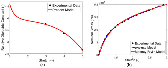 To determine the electric parameters of the model, the experiments from Wissler and Mazza [57] for VHB 4910 acrylic-based dielectric elastomer are used. In this regard, they presented the deformation-dependent relative electric permittivity under equi-biaxial deformation loading as shown in Figure 1a. The deformation gradient F and electric field vector E for the experimental condition of Wissler and Mazza’ work [57] can be expressed as: