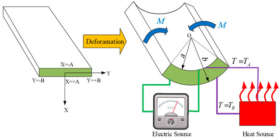 In this section, firstly, under a zero electric field and thermal effects (i.e., purely mechanical loading), the problem is verified using finite element software ABAQUS. Then, under coupling between thermal and mechanical loading, the proposed solution is verified. A moment is applied to one side of the actuator, while at the same time, a temperature difference is applied to the lower and upper surfaces of the actuator (as shown in Figure 2). It is noted that mesh type CPE8RHT, with an 8-node biquadratic displacement, bilinear temperature, reduced integration, hybrid with linear pressure was chosen for simulation. Also, the thickness of the actuator (2A) is set 0.2 m.