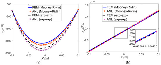 In this section, the large bending of the beam under purely mechanical loading (i.e., external mechanical moment) is investigated through FEM and the developed semi-analytical method. At mean radius of curvature 0.5 m, the radial and hoop stress for both hyperelastic models are depicted in Figure 3a,b, respectively.