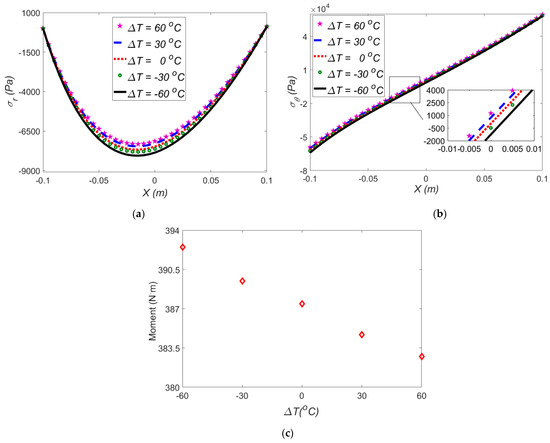As shown in Figure 5a,b, by changing the temperature difference from a high positive value to a high negative value, the radial and hoop stresses, and the induced moment start to increase. It is shown that, in ΔT = −60 °C, the radial stress is larger. It is noted that for a negative temperature gradient, an opposite thermal moment is produced; thus, an extra mechanical moment should be imposed to the beam to compensate this thermal moment. As shown in Figure 5b, the maximum hoop stress occurs at the lower surface of the beam in ΔT = −60 °C.
