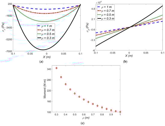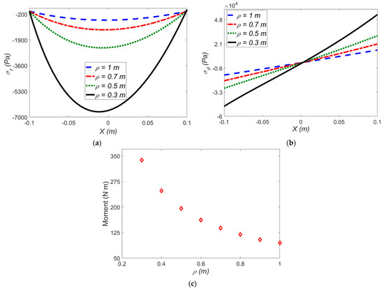 As shown in Figure 7a,b, the radial and hoop stresses decrease at smaller amounts of ρ in the presence of an electric field. To be more specific, from ρ = 0.3 to ρ = 0.5 m, the radial stress in the presence of electric field is reduced by 62%, while the radial stress in the absence of an electric field is lowered by 72%. Figure 7c shows the effect of mean radius of curvature on the induced moment.