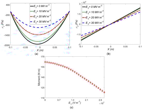 The effect of electric field on (a) radial stress; (b) hoop stress; (c) induced moment for Mooney-Rivlin model with ρ = 0.5 m and ΔT = 40 °C.