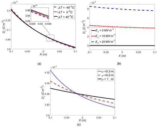 The effect of temperature gradient at a fixed electric field E1 = 10 MV·m−1 on the electric induction is depicted in Figure 10a, where a negative temperature gradient produces a higher radial electric field (at X < 0). A negative temperature gradient generates an opposite thermal moment and therefore larger stresses, induced moment and radial electric field are produced. It is observed that temperature gradient does not play a significant role on the electric induction in actuator. This is due to the value of the thermal expansion coefficient of VHB 4910. It means, if a dielectric with higher thermal expansion coefficient were chosen, the thermal part could play more prominent role in the results. Figure 10b depicts the effect of electric field on the electric induction at ΔT = 0 °C and ρ = 0.4 m, where a higher electric field results in a higher electric induction. Furthermore, the variation of the electric induction along the beam thickness is almost linear. Figure 10c shows the variation of electric induction with applied mean radius of curvature for ΔT = 0 °C and E1 = 10 MV·m−1. In addition, the variation of radial electric displacement in different mean radius of curvature is illustrated in Figure 10c which for larger mean radius of curvature, the radial electric displacement changes slightly.