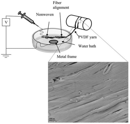 Traditionally, textiles are fabricated using yarns that are drawn from cotton fluffy mass and wound into spools []. These yarns consist of micron or macroscale cotton fibers. However, with the advancement in nanoscience, the textile industry is directing its attention to fabricate and incorporate nanofibers within the textiles []. It is well understood that single nanofibers are difficult to handle. Hence, they cannot be used directly in weaving or knitting to produce fabrics or textiles. Linear fiber assemblies that are obtained by collecting aligned nanofibers or yarn assemblies that are obtained by twisting the nanofibers ensure that the nanofibers are suitable for weaving or knitting. Over the past decade, researchers have modified the electrospinning setup to produce nanofiber yarns or linear nanofiber assemblies. For example, we have modified the electrospinning setup to collect linear nanofiber assemblies [,]. The schematic of the modified electrospinning setup used to collect linear nanofiber assemblies is shown in Figure 1. Here, the fibers are initially deposited on surface of water. They are then drawn out and wound around a mechanical drum. This process led to the alignment of the fibers and enabled us to collect aligned fiber assemblies.