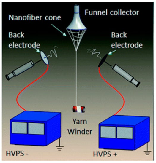 Others have obtained nanofiber yarns by using a conjugated electrospinning setup [,,]. Briefly, a polymer solutions are fed to two different spinnerets that are individually connected to positive and negative high voltage power supply. The fibers are spun onto a metal funnel and then drawn out using an insulating rod. The rotation of the metal funnel helps in twisting of the fiber bundles. In the final step, the fiber bundles in the form of yarns are wound around a yarn winder. Figure 2 shows the schematic of the conjugated electrospinning setup used to produce nanofiber yarns. These yarns are then interwoven to form fabrics.