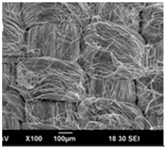 A similar setup is used to first produce polyacrylonitrile (PAN) yarns []. Following this, a traditional textile machine is used to produce fabrics from the PAN yarns. These PAN yarns are then braided by intertwining three of more yarns to make cylindrical patterns. PAN yarns are also used to produce fabrics with the help of weaving technique. Briefly, warp yarns are pre-stretched across a weaving frame. In the next step, the weft yarns are woven across in the perpendicular direction. Joseph et al. [] obtained yarns using electrospinning coupled with a substrateless deposition approach. Here, instead of using a funnel, the fibers are electrospun onto a flexible metal electrode placed such that it forms an open-ended frame of a funnel. The fibers are then pulled out as yarns and wound around a yarn winder. Following this, an industrial textile machine is used to ply, braid and weave the yarns to produce various kinds of constructs. They show that open-ended hollow structures can be fabricated by braiding of the yarns. These constructs show tremendous potential for stents and vascular graft applications. Figure 3 shows the scanning electron microscope (SEM) image of the woven construct obtained using these yarns. These woven structures are argued to have tremendous potential for drug-delivering implants.