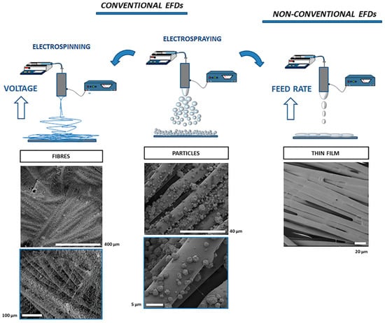 Schematic of the electrofluidodynamic (EFD) process and the corresponding SEM images of the fibers obtained using the EFD process. Reprinted from Journal of Colloid and Interface Science, Vol. 541, Francesca De Falco, Vincenzo Guarino, Gennaro Gentile, Mariacristina Cocca, Veronica Ambrogi, Luigi Ambrosio, Maurizio Avella, Design of functional textile coatings via non-conventional electrofluidodynamic processes, 367–375, Copyright (2019), with permission from Elsevier.