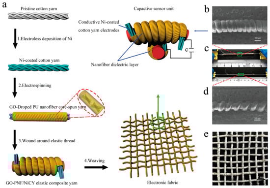 Using similar approach, textiles for wearable electronic skin applications can be developed by incorporating pressure-sensitive materials into the fabric [,,]. For such applications, functional polymers such as piezoelectric or conductive polymers are typically used and integrated into the fabrics [,,]. Alternative approach is to embed metal nanowires, functional ceramic nanoparticles or carbon nanostructures into the polymer before they are integrated into the fabric. The most common approach involves dispersion of carbon nanotubes (CNTs) or graphene directly into the polymer solution followed by electrospinning to obtain CNT/graphene incorporated polymer fibers [,]. The presence of CNT or graphene within the polymer fiber also serves to improve the mechanical strength of the fibers. In the study by You et al. [], graphene oxide doped polyurethane fibers obtained using electrospinning are wound around nickel coated cotton yarns to form core-spun yarns. The obtained core-spun yarns are then wound around an elastic thread, which is then woven to obtain a fabric. The schematic shown in Figure 6 illustrates the use of yarns for developing electronic fabrics. The cross-over points between the elastic composite yarns serve as capacitive mechanical sensor unit. Thus, when a pressure is applied to the fabric a change in the capacitance is detected. They demonstrated that the sensor unit has excellent pressure sensitivity of 1.59 N−1. This electronic fabric shows excellent performance in recording the body posture and movement. Thus, their results demonstrate that these fabrics can potentially be used as artificial skin and wearable health monitoring device.