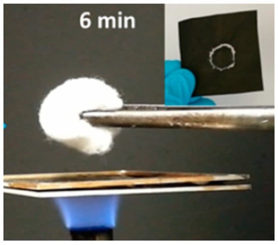 Kevlar fibers and aromatic polyamide, Nomex® fibers due to their flame-retardant characteristics show tremendous potential for developing thermal protective fabrics []. Similarly, polymers such as polyimide, polybenzimidazole and polyamide have high degradation temperature and have self-extinguishing ability due to their rigid backbones and chain-to-chain interactions []. Membranes fabricated using these high performance polymers offer several advantages such as breathability and heat resistance []. Thus, if electrospinning is used to produce nonwoven membranes using these high-performance polymers then they can also be used for thermal protective clothing applications. Zhu et al. [] used electrospinning to prepare composite materials based on polybisbenzimidazobenzophenanthroline-dione (BBB) and demonstrated that these materials do not sustain a flame or burn. BBB fibers are obtained by first preparing the precursor solution that consists of diaminobenzidine and 1,4,5,8-napththalene tetracarboxylic acid (NTCA). PVP solution is then added to this solution and finally the solution is electrospun to obtain precursor fibers. BBB fibers are obtained by heat treating these precursor fibers. Following this, the obtained BBB fibers are mechanically chopped to produce short BBB fibers. These short BBB fibers are dispersed in sodium hectorite (Hec) solution. Hec and BBB is then deposited on the thermoplastic polyurethane (TPU) membrane. In the following step, the TPU membrane is selectively etched out to obtain Hec/BBB composite fibers that do not ignite when in contact with flame. They argue that the Hec nanosheets in the composite forms a layer and hinders the volatiles from passing through the membrane. The heat transfer across the membrane is retarded. The authors [] demonstrated that BBB polymer pyrolyzes when neat BBB membrane is brought in contact with flame. On the other hand, Hec/BBB membrane is shown to sustain contact with the flame. Figure 9 shows the setup used to demonstrate the thermal stability and flame-retardancy of the Hec/BBB membrane. The membrane is shown to shield and protect a cotton ball from the flame.