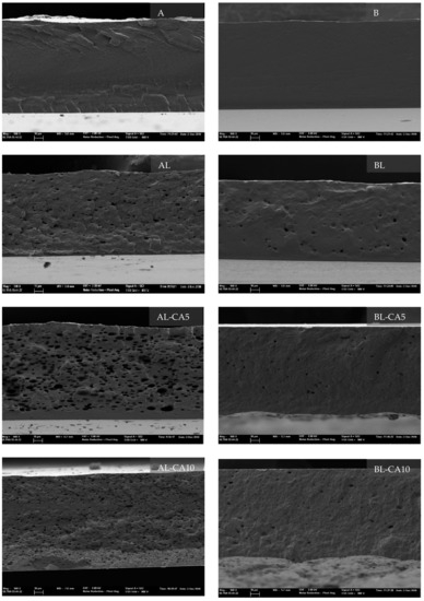 Field Emission Scanning Electron Microscope (FESEM) micrographs of the cross-section of the poly (vinyl) alcohol (PVA) A and B films with lecithin liposomes (L) and carvacrol loaded liposomes (L-CA) (5 or 10 g/100 g PVA) (magnification: 500X; bar: 10 μm).