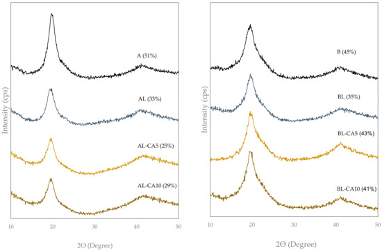 The crystallization pattern and degree of crystallinity of the films were analysed through the DRX spectra (Figure 2), all of which showed the typical PVA crystalline peaks at around 2Ө of 20° and 41°. The crystallinity of films A (51%) was higher than that of films B (45%), as previously described by [34], which was attributed to the presence of acetyl groups in the B chains that provoke a steric hindrance for the crystalline molecular arrangement. The incorporation of liposomes (loaded or not with CA) led to a significant decrease in the crystalline fraction of matrix A. This could be due to the presence of the dispersed lipid phase that might disrupt the normal organization of polymeric chains. The AL-CA5 samples had the lowest crystallinity value (25%), in line with the more heterogeneous distribution of lipid fraction in the matrix (Figure 1), as previously commented on. On the other hand, even though the non-loaded liposomes promoted a drop in crystallinity of films B (35%), the liposomes containing CA gave rise to films with crystallinity that was similar to that of pure polymer films. Andrade et al. [34] observed an increase in the crystallinity of PVA B films when these contained carvacrol, which was attributed to the specific interactions of the carvacrol molecule and PVA chains that could favour the molecular arrangement in the crystalline domains. Subsequently, the decrease in crystallinity provoked by the lecithin incorporation was less significant when liposomes carried carvacrol, whose delivery and interaction with the polymer chains enhance crystallinity. The different crystallinity degree of the films affected their functional properties, as described below.