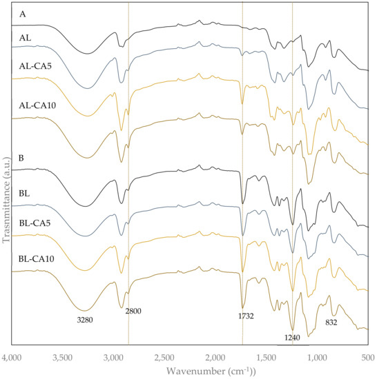 FTIR spectra of the PVA films (A and B) without and with carvacrol (5 or 10 g/100 g PVA) previously encapsulated in lecithin liposomes (L).