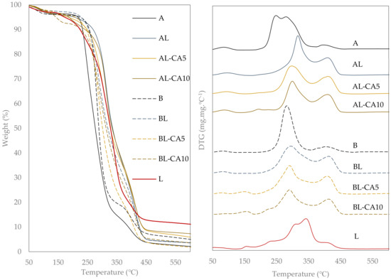 Thermogravimetric analysis (TGA) (left) and DTGA (right) curves of the PVA films (A and B) without and with carvacrol (5 or 10 g/100 g PVA) previously encapsulated in lecithin liposomes (L).