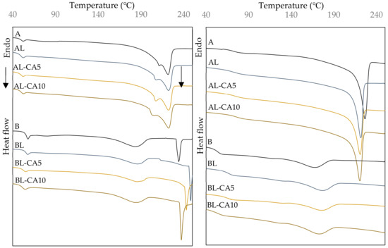 DSC thermograms of the first heating scan (Figure 5 show several endothermic events between 140 °C and 250 °C for both A and B polymers. Polymer A presented peaks at 215 °C and 225 °C that suggest two successive melting events, which is in line with the existence of crystalline forms of different sizes leading to different melting temperatures. When liposomes were incorporated, the melting enthalpy increased, which suggests that lipid compounds could enhance the PVA crystallization in the smallest crystals, since it was the peak at the lower temperature that was promoted. The partial vaporization of CA thermo-released in this temperature range could also contribute to the enthalpy increase. Matrix B exhibited a melting endotherm at 183 ℃ with enthalpy values that were lower than matrix A. In this case, the incorporation of lipid compounds (lecithin and CA) did not modify the Tm value or the enthalpy. Nevertheless, a second endothermic peak was present in all of samples B above 230 °C, which must be attributed to the early endothermic degradation reactions (deacetylation) of the polymer that start at this temperature [43,46].