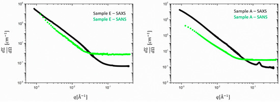 Absolutely calibrated SAXS (black) and SANS (green) data for samples E (left) and A (right). The data are not background-corrected.