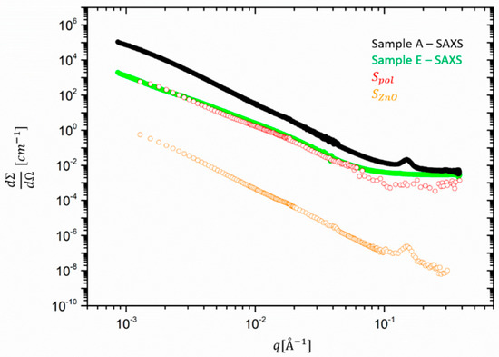 In Figure 2, we compare extracted Spol and SZn0 with the SAXS intensities of sample A and E. The contribution of the ZnO form factor to the SANS curves results to be irrelevant as we show later. The partial form factors and , respectively in red and orange, were shifted by an arbitrary factor along the y axis for the sake of comparison with the experimental data.