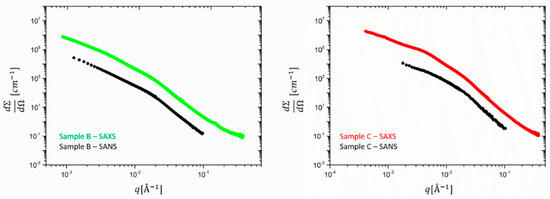 Going to filled rubbers, Figure 3 shows a comparison between the SAXS and SANS averaged scattering intensities obtained for samples B and C (respectively, 30 and 60 phr silica). Besides the different absolute intensity and q-range due to instrumental factors, SANS and SAXS curves show different low-to-intermediate q < 0.01 Å−1 behavior. In addition, it can be seen that for q > 0.01 Å−1 the silica particle structure dominates in both SAXS and SANS.
