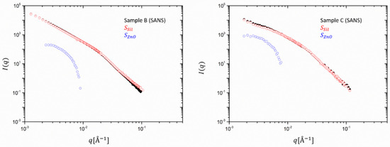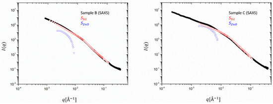 Besides the different extension in the q-range due to instrumental factors, the SAXS data show in both cases a shallow peak or shoulder around q ~ 4 10−3 Å−1, which cannot be seen in the SANS results. This is attributed to ZnO, which has a much stronger contribution in the X-ray intensity than in the neutron data, as already observed for the unfilled rubbers. Interestingly, sample C presents a more pronounced peak with respect to sample B, probably due to the lower contribution of the smaller clusters to the scattering function. In Figure 4, the partial contributions and are multiplied by the contrast factors, as shown in Equation (6) and the experimental SAXS intensities are re-constructed. ZnO contributes to 10% to the total intensity for sample B (30 phr) but amounts to ~50% for C. The scattering at high q is fully determined by silica and consolidates a rather particle-like morphology for ZnO, its form factor dropping with q−4.
