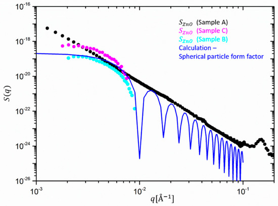 The structure of ZnO, i.e., their q-dependence in the filled rubbers is, however, very different in comparison to that, extracted from the unfilled sample, as shown in Figure 6. In the case of sample A, the full scattering range could be accessed, and a typical power-law-like behavior as for silica is found. The slope at high q is close to −3.8 and indicates some deviation from smooth spherical behavior. Interestingly, the ZnO partial structure factor extracted from sample A does not exhibit any Guinier-like behavior at the lowest q, as shown by samples B and C. This indicates that either large ZnO clusters are formed in the case of the unfilled rubber in comparison to the silica-filled ones, which prevent the appearance of the Guinier region in the accessible q-range, or huge micron-sized strongly polydisperse and rough particles are still present, the size of which is larger than R > 1/qmin =1000 Å =0.1 .
