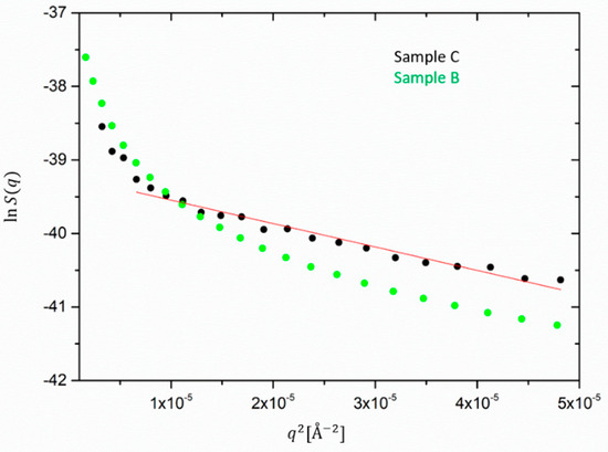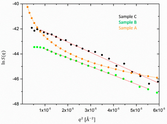 Next, silica is discussed. For the silica-extracted form factor, shown in Figure 7, an average radius of gyration Rg can be determined only for sample C because sample B does not exhibit a Guinier-like behavior or is more polydisperse. A cluster size of about 280 Å is obtained from the linear fit of the Guinier plot of and an increase is expected with a lower volume fraction. However, it has to be taken into account that the extraction of the silica cluster size from the Guinier-like description consists also of an approximation, as sample C does show a deviation from the simple Guinier behavior at low q. This extrapolation neither takes into account the polydispersity nor the interactions between the clusters. A more precise estimation of the silica cluster sizes is out of the scope of this work. A fit to a hierarchical scattering model is treated in a recently published work [31].