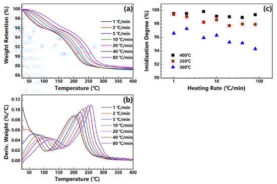 - Chen, W.J.; Chen, W.; Zhang, B.Q.; Yang, S.Y.; Liu, C.Y. Thermal imidization process of polyimide film: Interplay between solvent evaporation and imidization. Polymer 2017, 109, 205–215. [Google Scholar] [CrossRef]