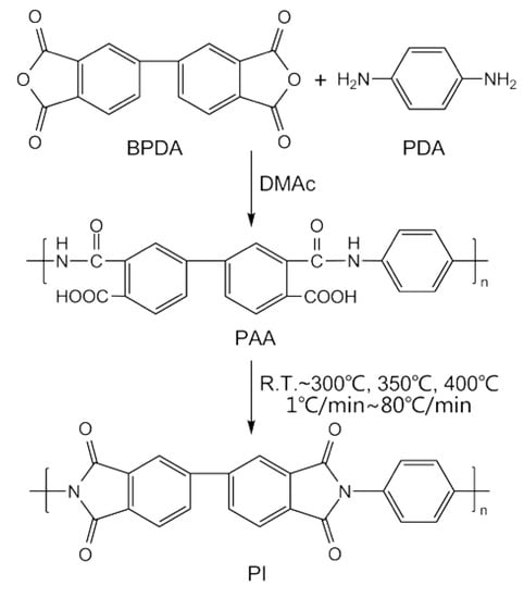 - Ishii, J.; Takata, A.; Oami, Y.; Yokota, R.; Vladimirov, L.; Hasegawa, M. Spontaneous molecular orientation of polyimides induced by thermal imidization (6). Mechanism of negative in-plane CTE generation in non-stretched polyimide films. Eur. Polym. J. 2010, 46, 681–693. [Google Scholar] [CrossRef]