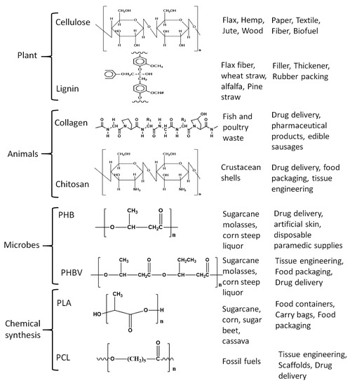 The ever-rising concern about the environmental impact of synthetic polymers has stimulated a great deal of research interest in the polymers of biological origins. The combination of sustainability and biodegradability of biopolymers is the reason they are gaining precedence over the fossil fuel-derived polymers [1]. Historically, biopolymers had commanded a lot of importance in various applications such as food, clothing, ropes, and furniture [2]. However, since the discovery of synthetic polymers, these biopolymers were replaced. With the increasing public awareness of global warming and the environmental toll as well as the rapidly depleting fuel sources, these biomaterials are emerging as a potential replacement for conventional polymers; during the last two decades, this interest has been the driving force in the development of sustainable biopolymers from renewable sources [3,4,5].