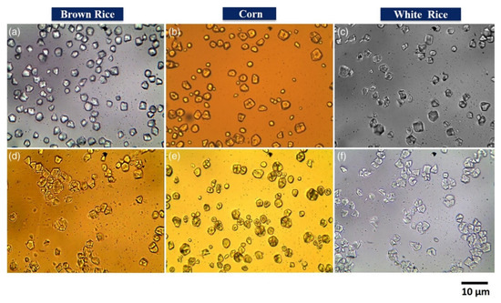 Optical microscopic (40× magnification) images of starch granules of native (a) brown rice, (b) corn, and (c) white rice. Hydrolyzed (d) brown rice, (e) corn, and (f) white rice [67]. (Reprinted with permission from Govindaraju et al., 2020.)