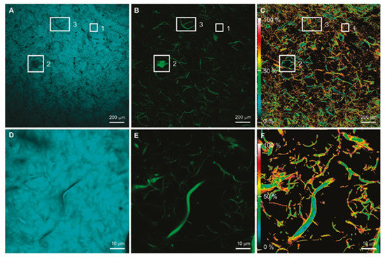 (A) Coumarin 30 (C30) fluorescence (donor filter set) at 5× magnification; (B) cellulose nanofibril (CNF) fluorescence (acceptor filter set) at 5× magnificationl (C) energy transfer efficiency map at 5× magnification; (D) C30 fluorescence at 100× magnification; (E) CNF fluorescence at 100× magnification; (F) energy-transfer-efficiency map at 100× magnification [111]. (Reprinted with permission from Zammarano et al., 2011.)