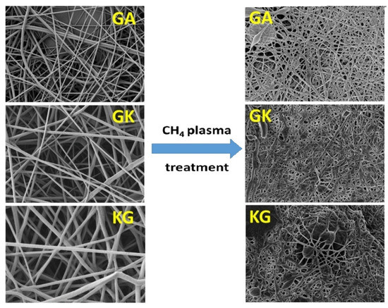 SEM images of polyvinyl alcohol (PVA)/gum Arabic (GA), PVA/gum Karaya (GK), and PVA/Kondagogu gum (KG) before and after plasma treatment [19]. (Reprinted with permission from Padil et al., 2016.)